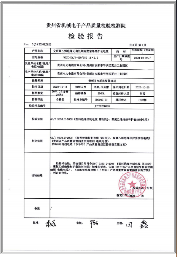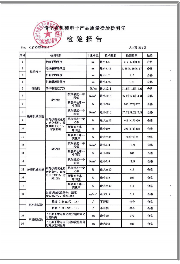 交聯(lián)聚乙烯絕緣無(wú)鹵低煙阻燃聚烯烴護(hù)套電纜 檢驗(yàn)報(bào)告